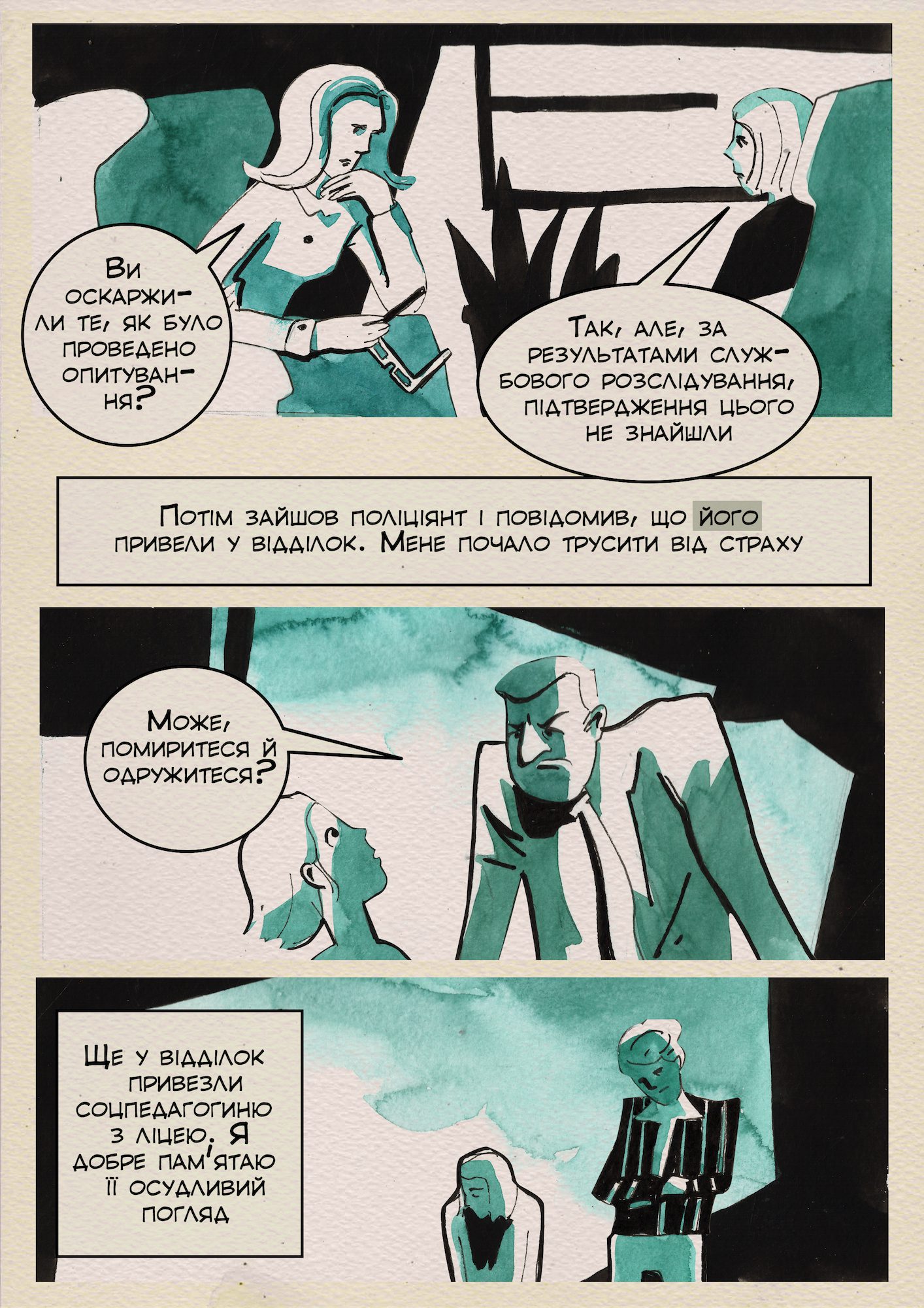Марія Бліндюк також розповіла про досвід під час збору інформації для майбутнього коміксу: «Найскладніше почути від жертви зґвалтування те, що вона відчуває емоційно та психологічно після пережитого. Її зневіра в людях через те, що однокласники й однокласниці її не підтримали й зацькували. Зневіра в системі, яка теж відразу поставилася до її свідчень зі скепсисом і зневагою. Коли читаєш про це в тексті, героїню не бачиш. А тут перед тобою сидить дитина, в якої весь світ руйнується. Треба було нагадувати собі, що я тут в ролі журналістки. Знову ж, в цьому сила візуальності коміксу — ми бачимо, що жертвою сексуального насильства стала неповнолітня підлітка, в якої є емоції».