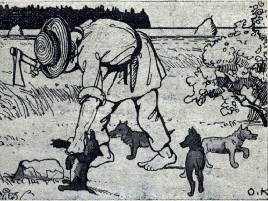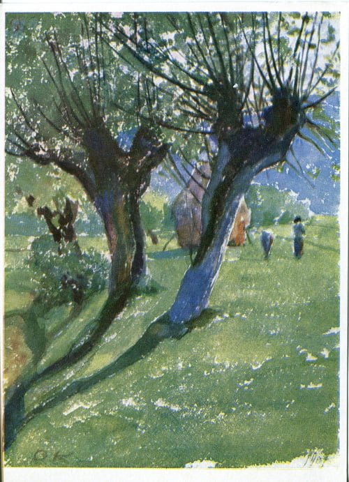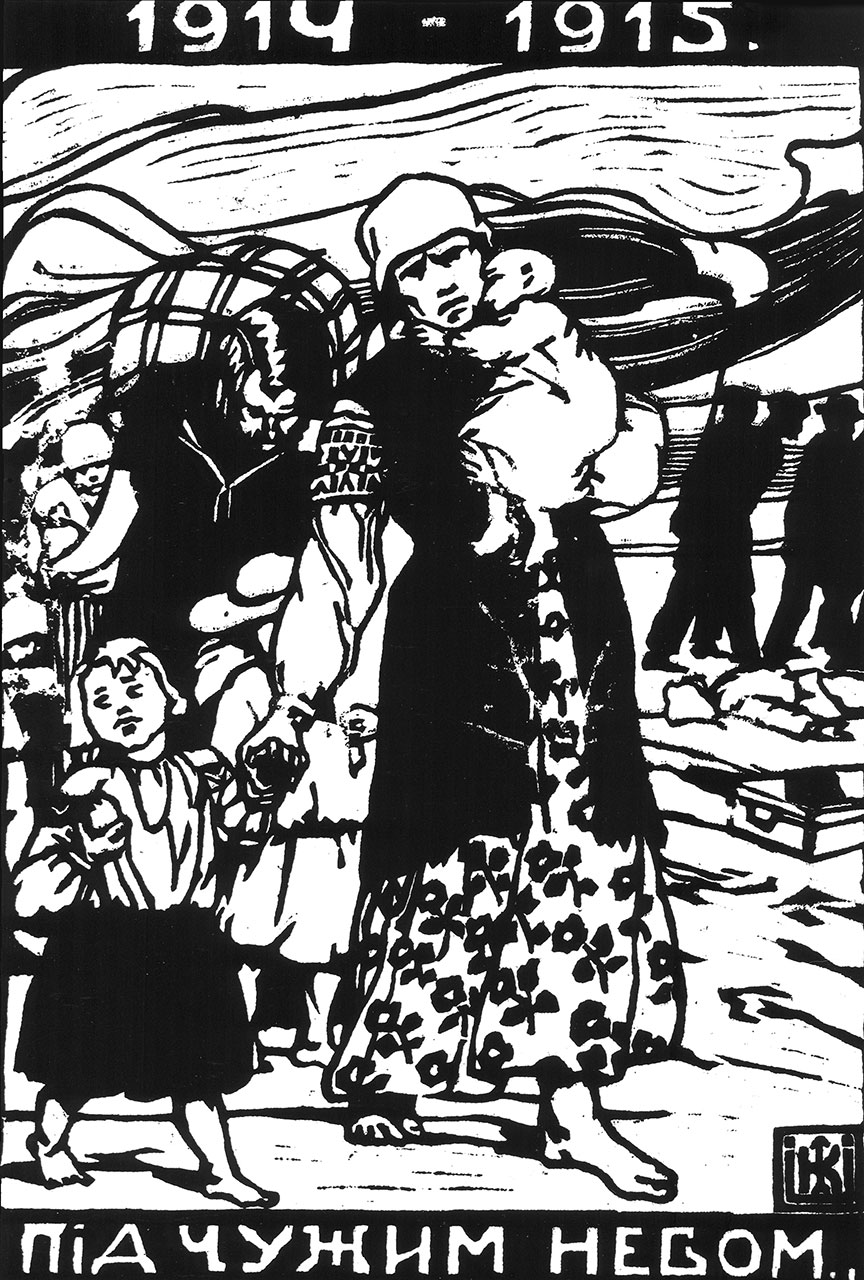 Офорт «За море» (1914) змінює підхід до явища у графіці: перед глядачем — трагічна сцена прощання селян із хатою.