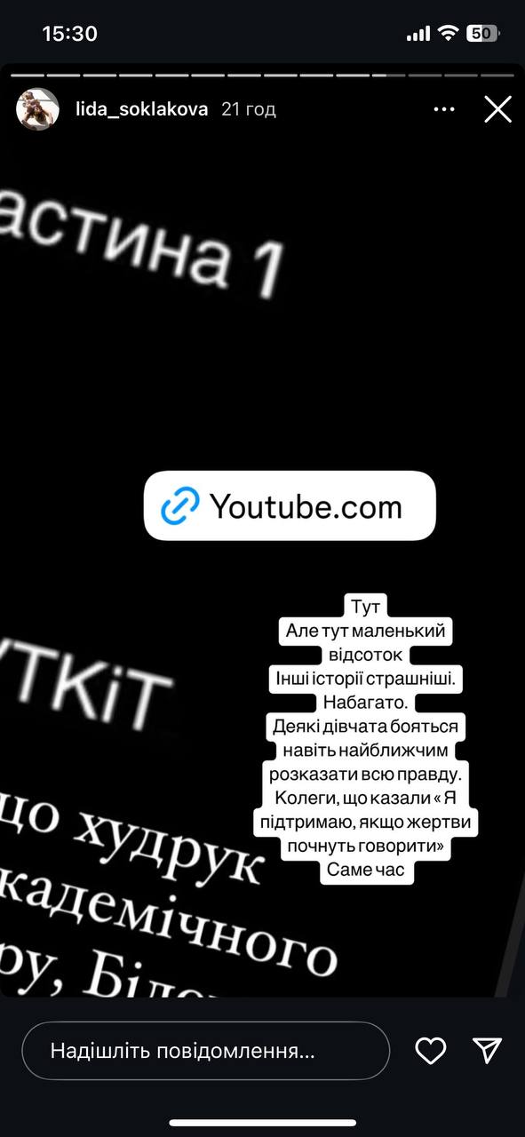 «Ви навіть не пробуєте захистити студенток та уникаєте відповідальності. Така репутація обов’язково мусить накласти на ваш навчальний заклад клеймо, щоб дати майбутнім студентам та студенткам можливість його не вибирати. Елементарно Ви хоча б могли відсторонити викладача на час розслідування і принести співчуття всім можливим постраждалим», — написала вона.