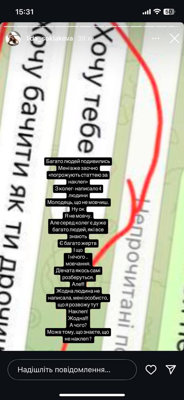 «Колеги, які все знають. У мене до вас прохання — не мовчіть про страшні речі. Жертви, я знаю, що страшно, але якщо ви наберетеся сміливості — це буде найкраще рішення для нашого спільного майбутнього», — додала вона.
