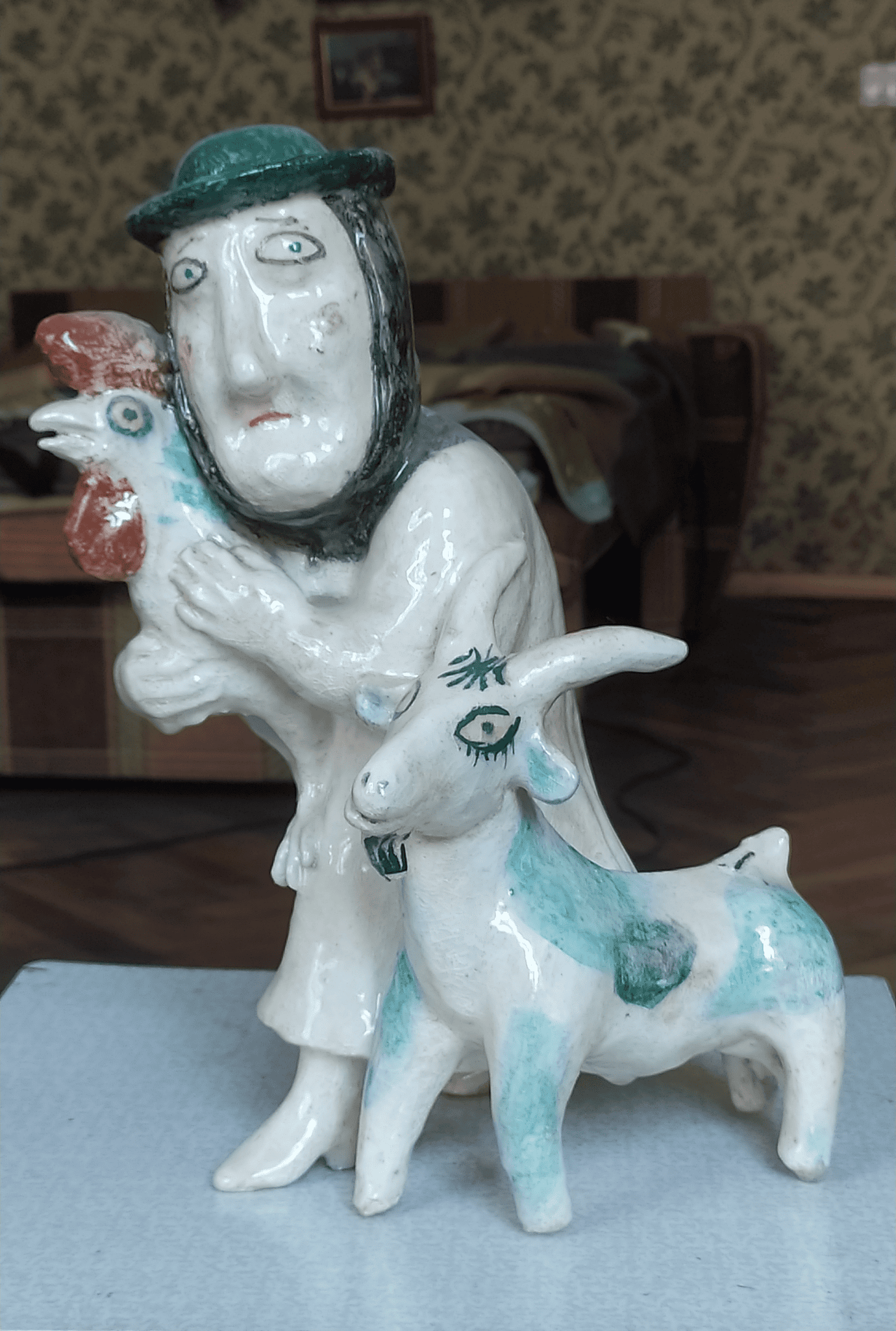 Перелякана бабця у капелюсі та хусточці обережно притискає до себе півника та кудись крокує разом із ним та козою. Як і більшість персонажів Ольги Перецівни, кумедна бабця викликає водночас і посмішку, і співчуття. Почуття тривоги за своїх близьких українці змушені проживати щодня, і тому робота набуває актуальності. Ця зворушлива керамічна композиція — одна з улюблених серед робіт художниці для її доньки Катерини.
