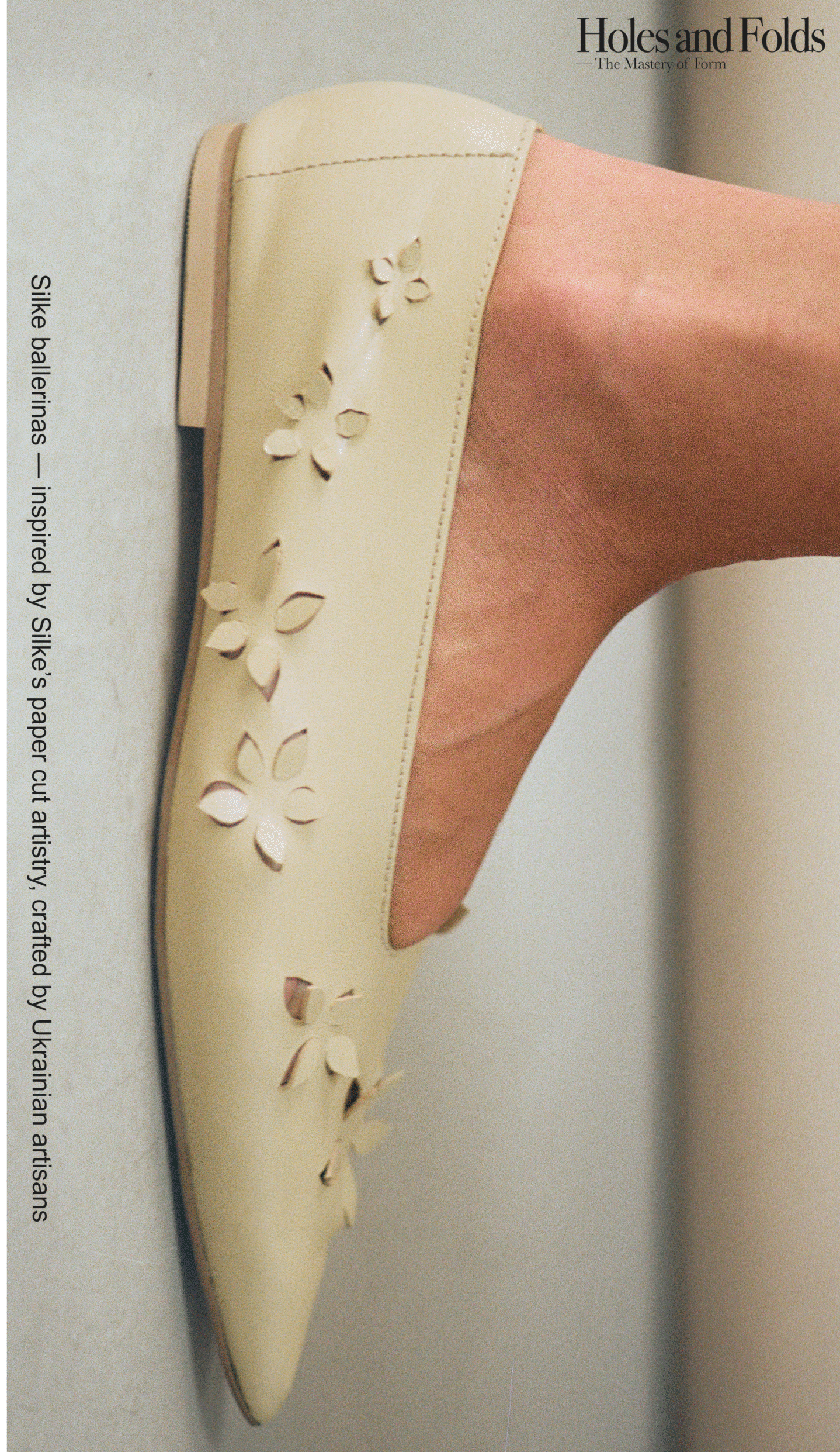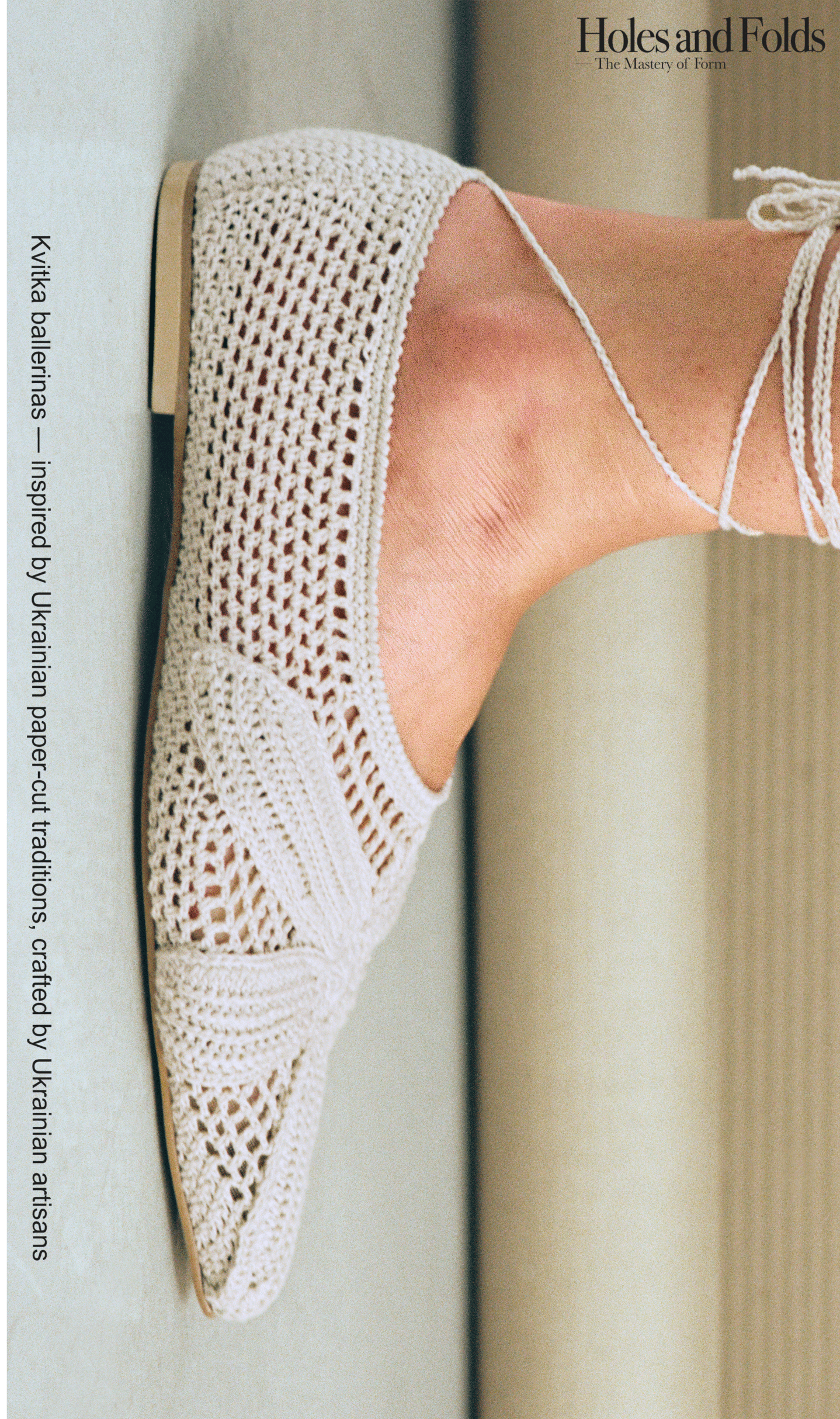«Вперше ми представили в’язані балетки у формі з гострим мисом. Балетки, мереживна фактура яких навіяна українськими витинанками, де в центрі композиції — велика гостролиста квітка. В’яжуться такі вручну гачком упродовж 30 годин, — розповідає команда бренда. — До роботи ми залучили художницю Юстину, яка створила серію ілюстрацій наших моделей взуття на гофрокартоні. Наївних, як саме літо, та графічних і точних, як наші перфоровані елементи. А Катерина, тренерка спортивної студії, що взяла участь у зніманнях, завершила цей процес. Її сильне тіло, що відшліфоване наполегливою працею, дисципліною та силою волі, складається й розкладається, немов паперовий аркуш у руках талановитого майстра. Паралель із паперовими об’єктами, яку ми проводимо крізь всі етапи створення колекції, від задуму до реалізації знімань».