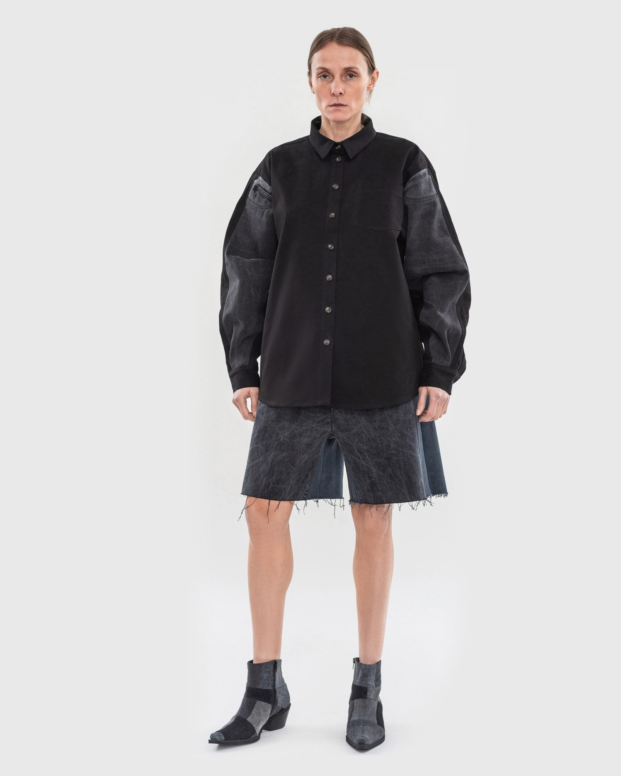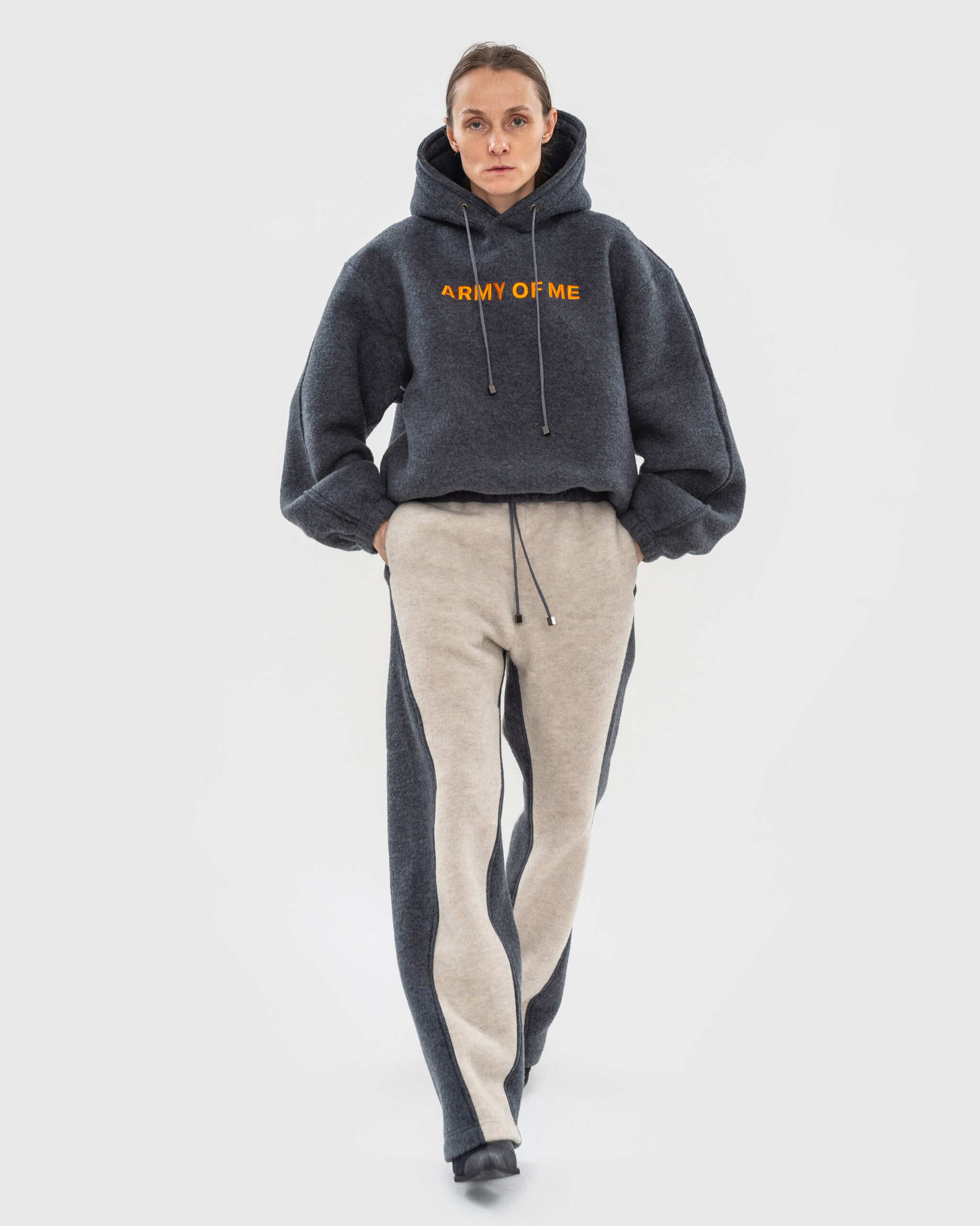 Особливістю колекції стало переосмислення чоловічого гардероба у жіночий. До неї увійшли бомбери, жилети, сорочки, футболки, корсети та худі, а також спідниці, джинси й шорти з чіткими силуетами у приглушених тонах та утилітарній естетиці.